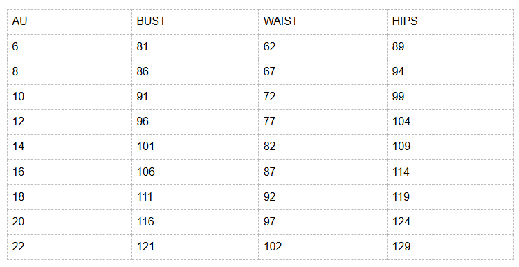 | AU | BUST | WAIST | HIPS |
