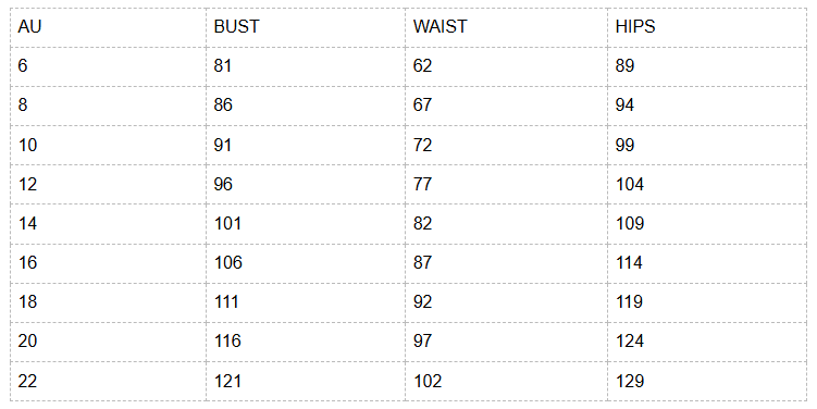 Please note that measurements may vary between garments due to fabric, fit and style. Check your body measurements against this guide to ensure the right fit.